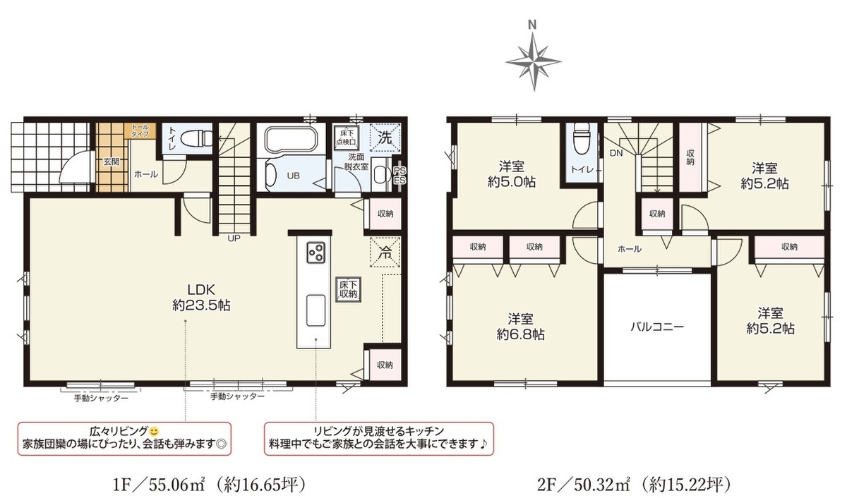 - 「リビング23帖超え」「駐車全棟2台可能」「耐震等級3」取得