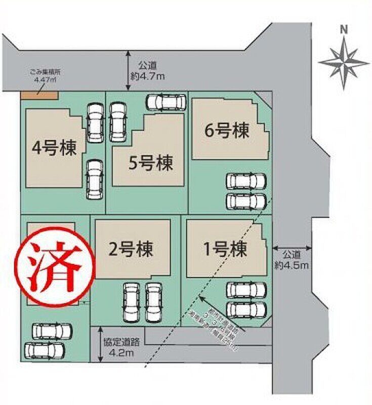 | 駐車場 | 1台 ~ 2台(※車種による) | 道路の幅員 | 北側4.7m公道に接道、東側4.5m公道に接道 |