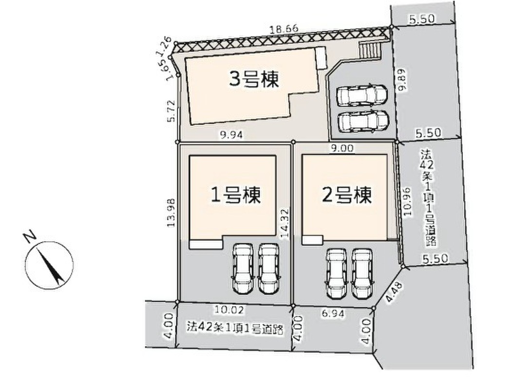 | 駐車場 | 1台 ~ 2台(※車種による) | 道路の幅員 | 南東側5.5m公道に接道、南西側4m公道に接道 |