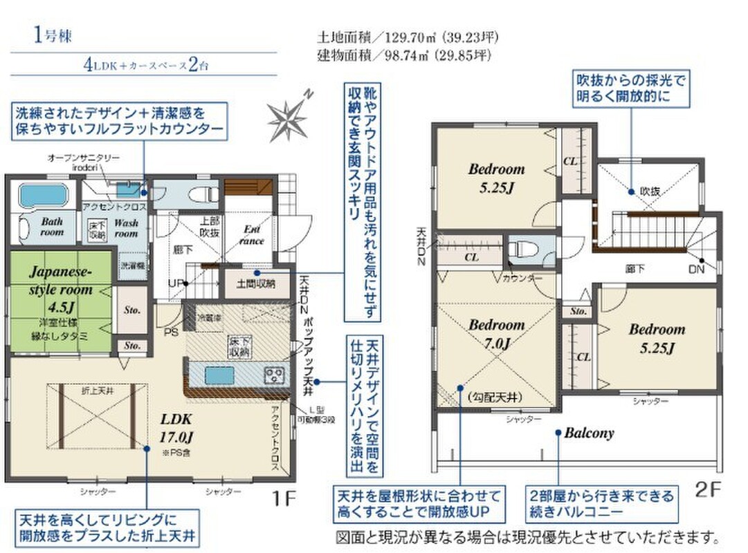 - 「都市ガス採用」「駐車全棟2台可能」「長期優良住宅」