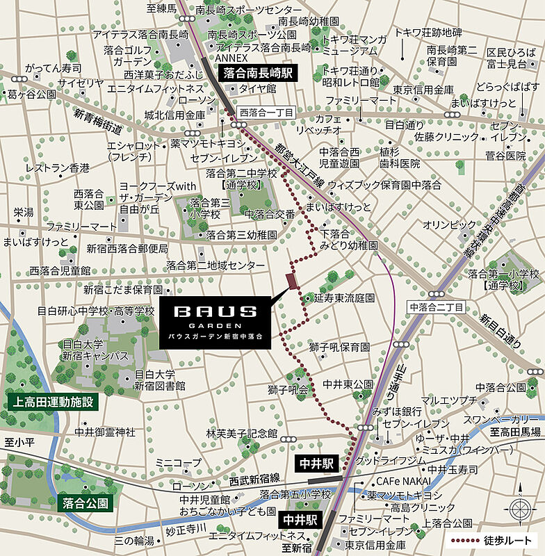 都営大江戸線「落合南長崎」駅 徒歩7分~8分 西武新宿線「中井」駅 徒歩7分~8分 東京メトロ東西線「落合」駅 徒歩15分 |