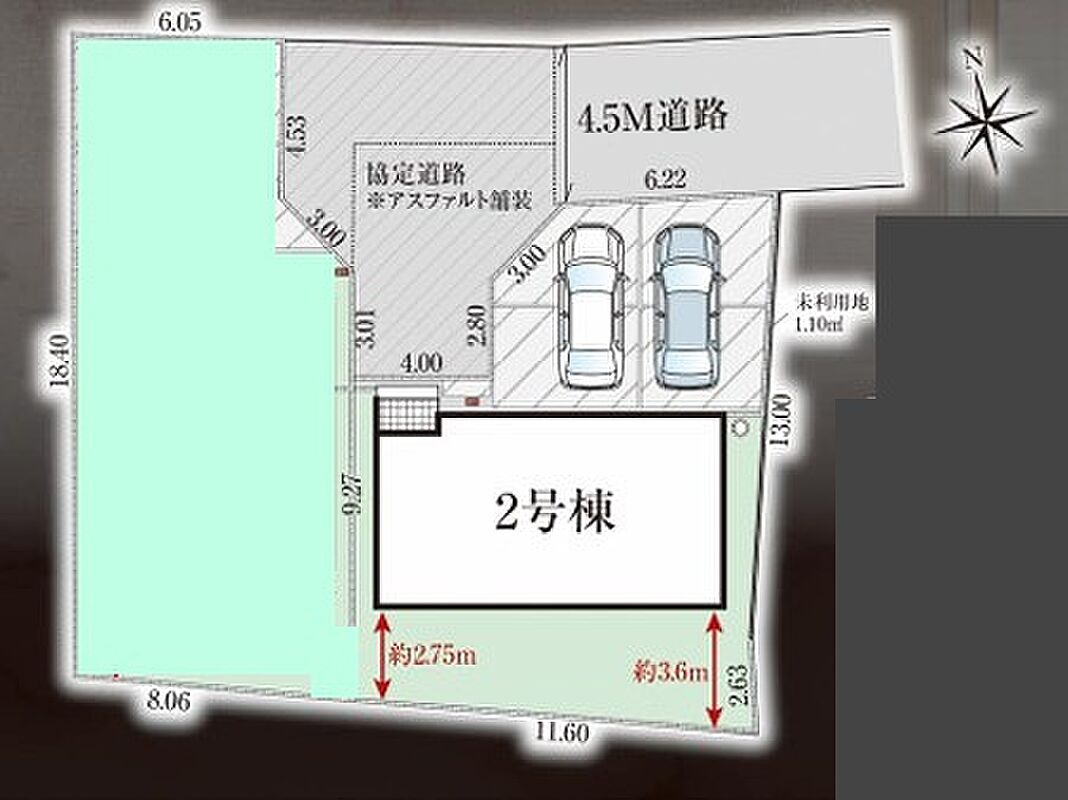 | 駐車場 | 2台 | 道路の幅員 | 道路幅:4.5m、アスファルト舗装、東 4.5m 私道 |