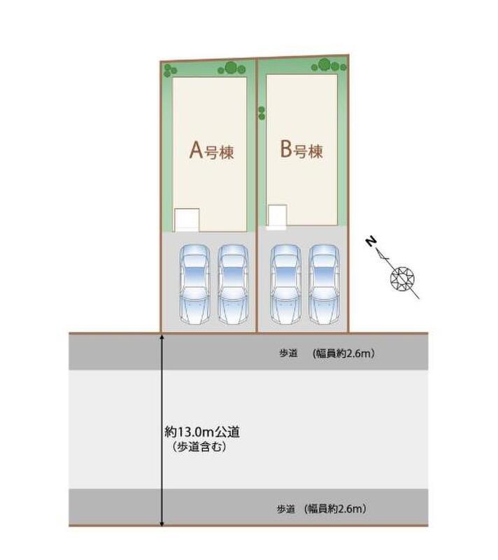 | 駐車場 | 2台 | 道路の幅員 | 道路幅:13m、アスファルト舗装、南西側公道 |
