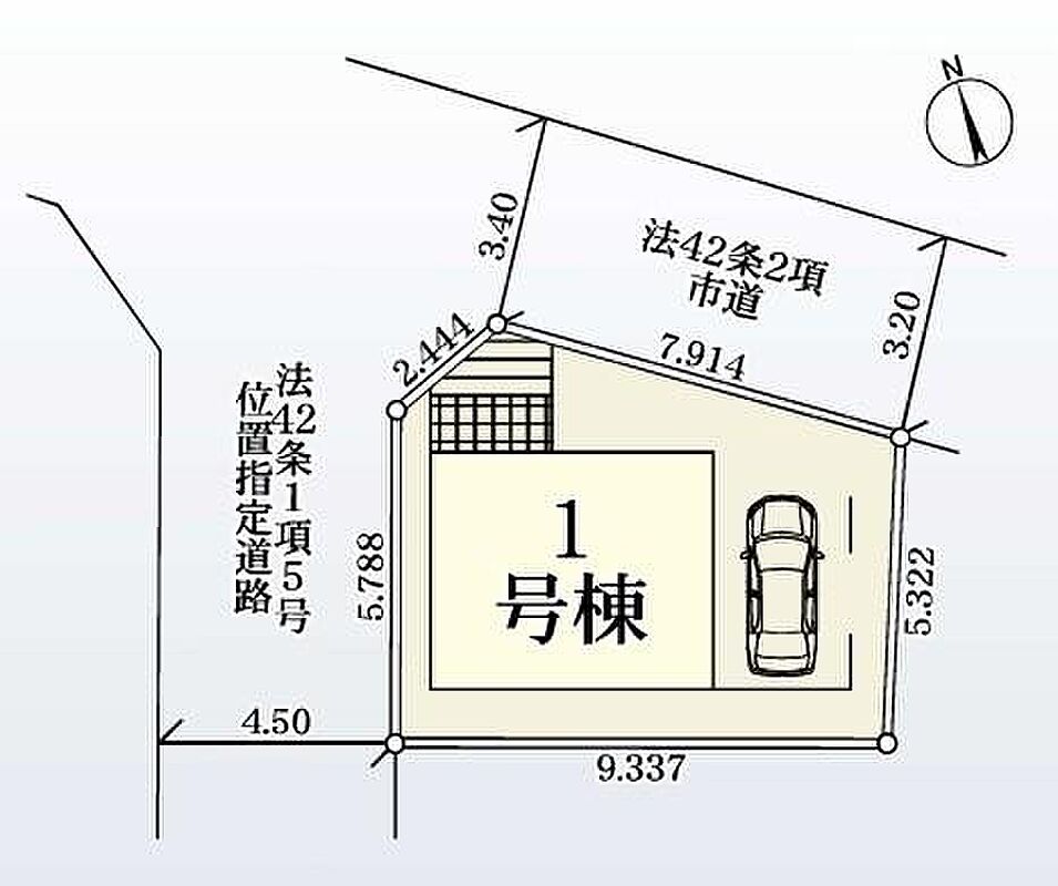| 駐車場 | 1台 | 道路の幅員 | 道路幅:3.6m~4.5m、アスファルト舗装、角地 : 北西 4.5m 私道、北東 3.6m 公道 |