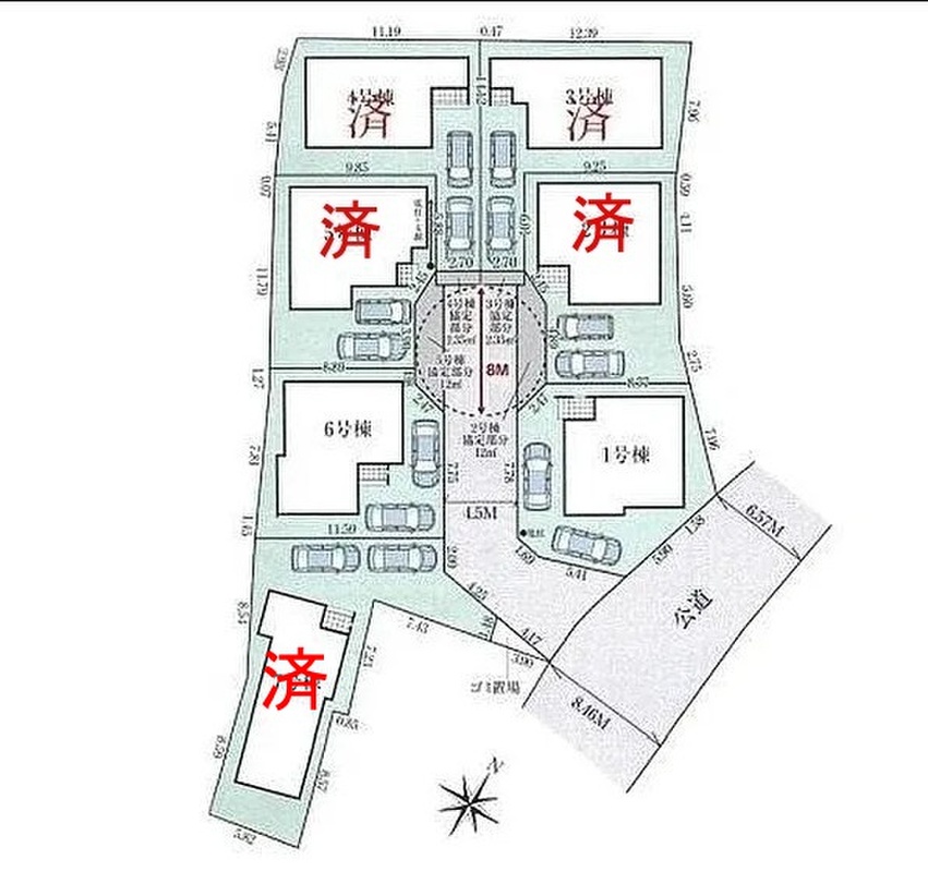 | 駐車場 | 2台 | 道路の幅員 | 道路幅:6.7m、アスファルト舗装、東側6.75m公道、区画内4.5m道路 |