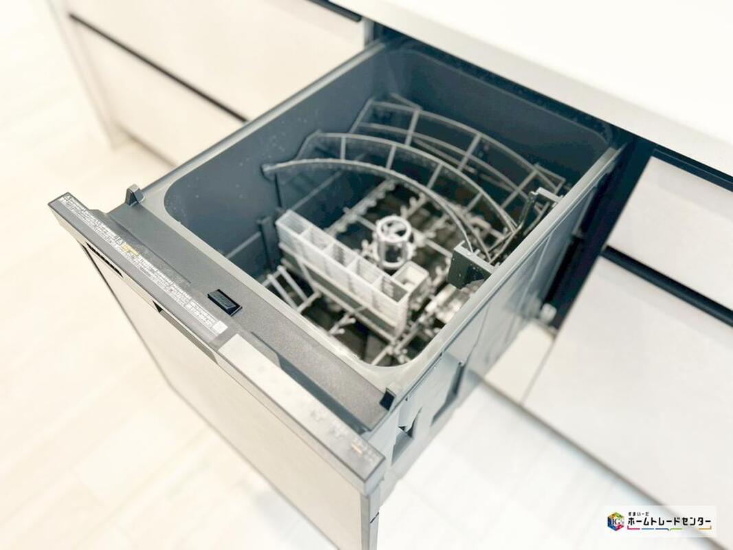 ビルトインタイプの食器洗浄乾燥機。調理道具と食後のお皿などを一度に洗えて効率的。浮いたゆとり時間を家族団らんや自分時間に♪