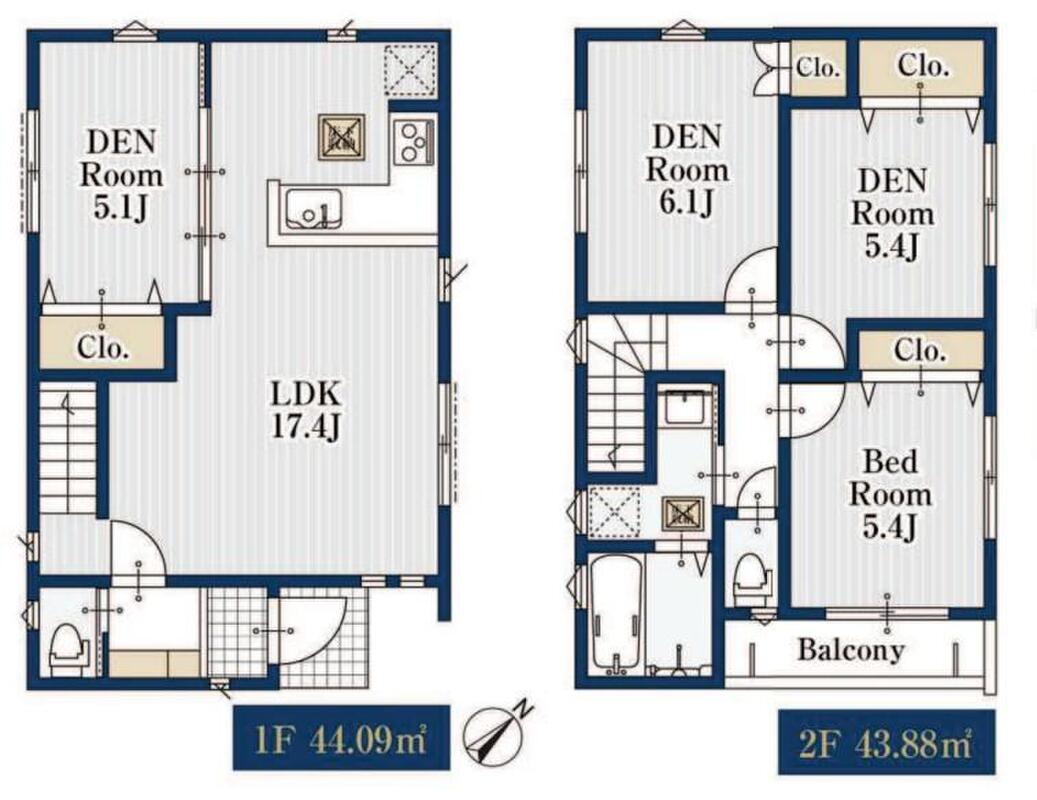 | 建物面積 | 86.11m2・87.97m2(26.04坪・26.61坪) | 土地面積 | 91.44m2・91.58m2(27.66坪・27.70坪) |