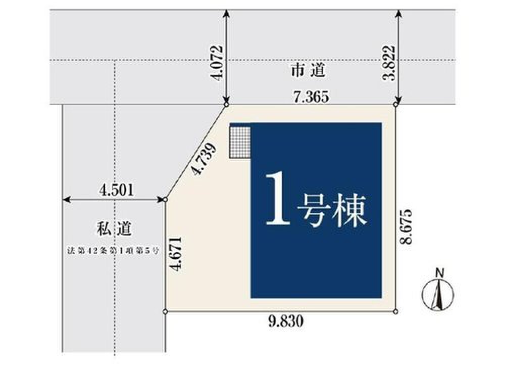 | 駐車場 | 1台 | 道路の幅員 | 道路幅:3.8m~4.5m、アスファルト舗装、角地 : 西 4.5m 私道、北 3.82m 公道 |