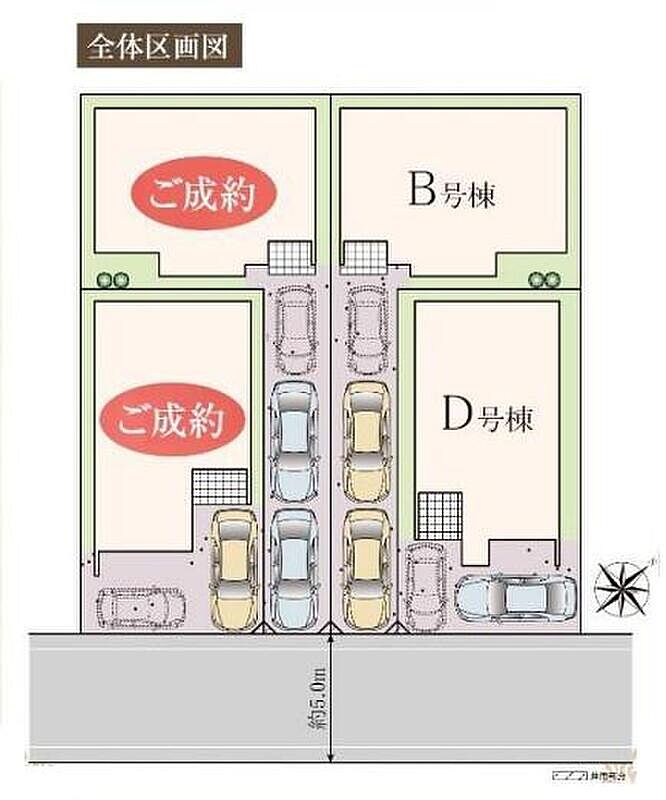 | 駐車場 | 2台 ~ 3台(B号棟(3台)、D号棟(2台)) | 道路の幅員 | 道路幅:5m、アスファルト舗装、南東 5m 公道 |