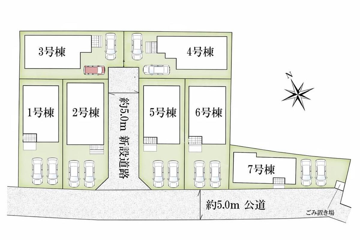 | 駐車場 | 2台(車種による) | 道路の幅員 | 道路幅:5m、アスファルト舗装、【1・6・7号棟】南西:約5m公道 以下備考欄に記載 |