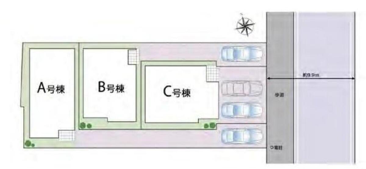 | 駐車場 | 1台 ~ 2台(A・B号棟(1台)/C号棟(2台)) | 道路の幅員 | 道路幅:9.9m、アスファルト舗装、東側約9.9m公道 |