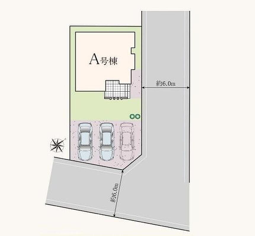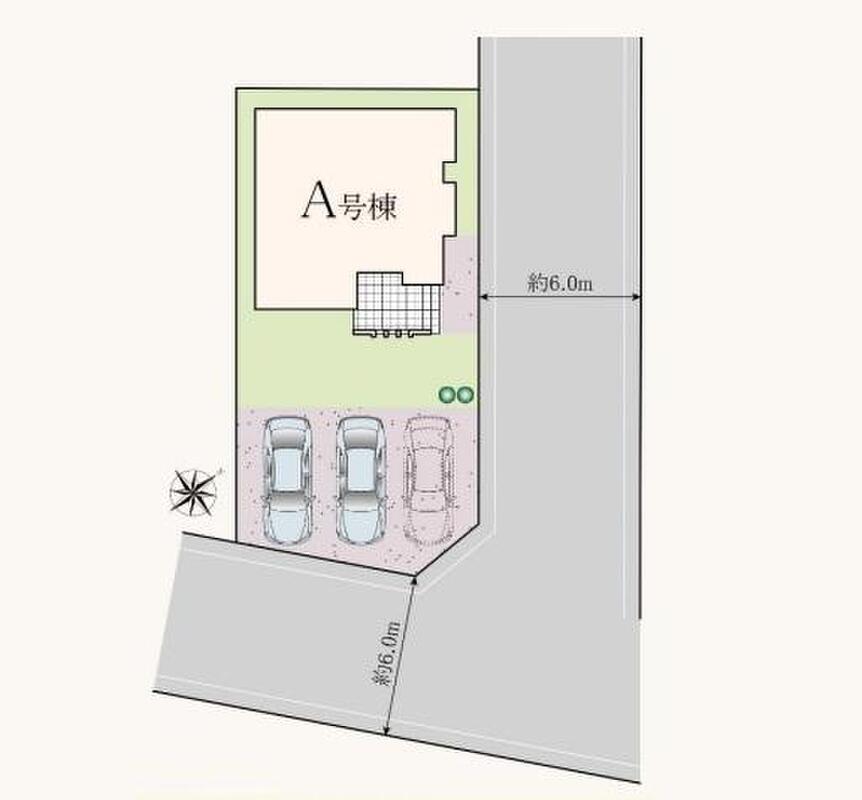 | 駐車場 | 2台 ~ 3台 | 道路の幅員 | 道路幅:6m、アスファルト舗装、北東側約6.0m公道、南東側約6.0m公道 |