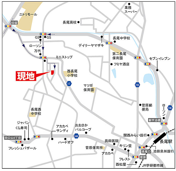 JR片町線(学研都市線)「長尾」駅 徒歩28分 自転車 約9分 JR片町線(学研都市線)「藤阪」駅 徒歩34分 自転車 約9分 |
