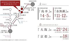 JR東海道・山陽本線「島本」駅 徒歩4分 阪急京都本線「水無瀬」駅 徒歩11分~12分 |