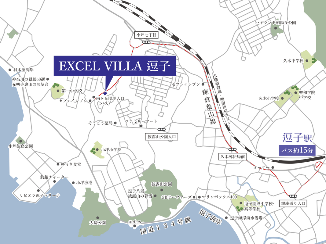 JR横須賀線「鎌倉」駅 約9分 「緑ヶ丘入口」バス停徒歩約6分 車で10 JR横須賀線「逗子」駅 約15分 「南ヶ丘団地入口」バス停徒歩約1分 車で8分 京急逗子線「逗子・葉山」駅 約8分 「南ヶ丘団地入口」バス停徒歩約1分 車で9分 |