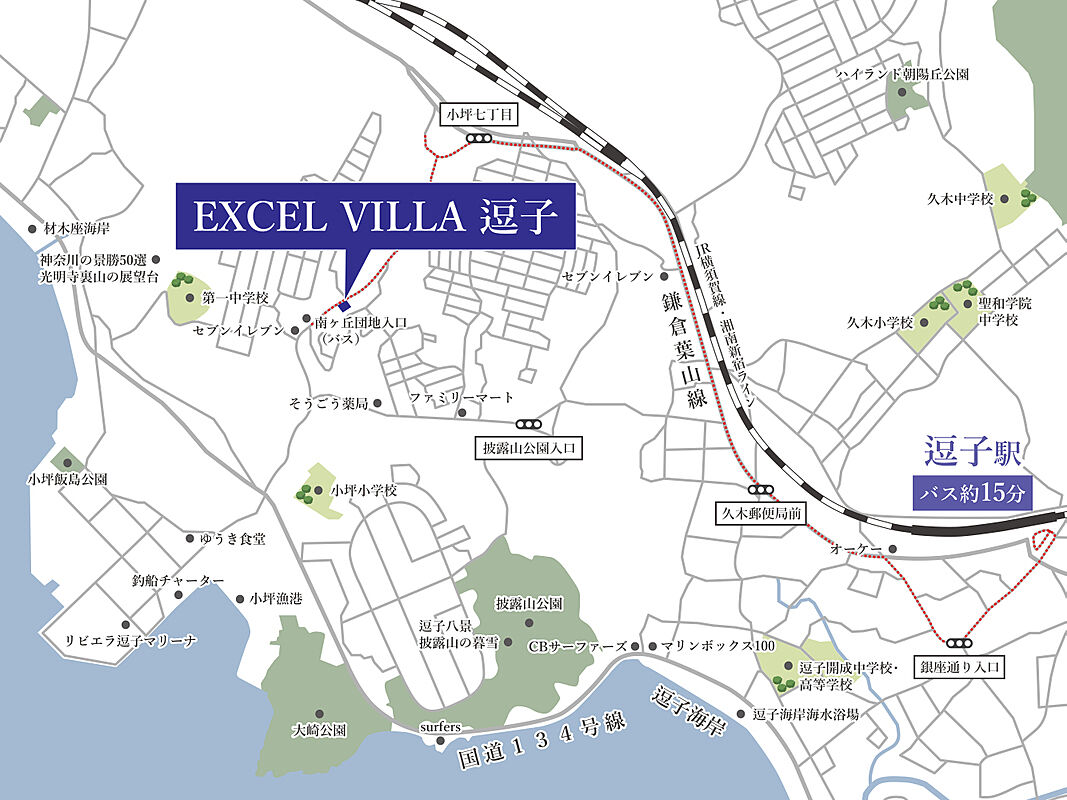 JR横須賀線「鎌倉」駅 約9分 「緑ヶ丘入口」バス停徒歩約6分 車で10 JR横須賀線「逗子」駅 約15分 「南ヶ丘団地入口」バス停徒歩約1分 車で8分 京急逗子線「逗子・葉山」駅 約8分 「南ヶ丘団地入口」バス停徒歩約1分 車で9分 |