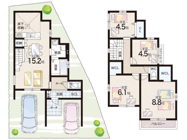 - ※完成予想図やCG合成画像は、門塀・植栽・庭・外観等、実際とは多少異なる場合があります。