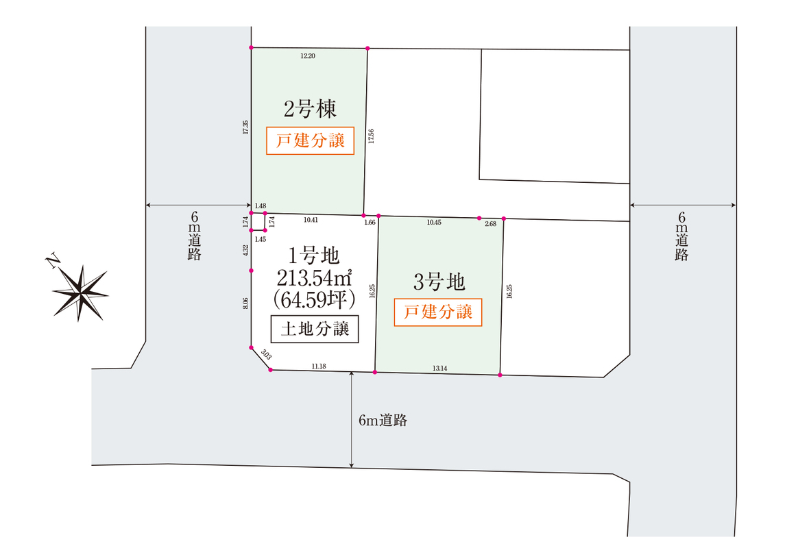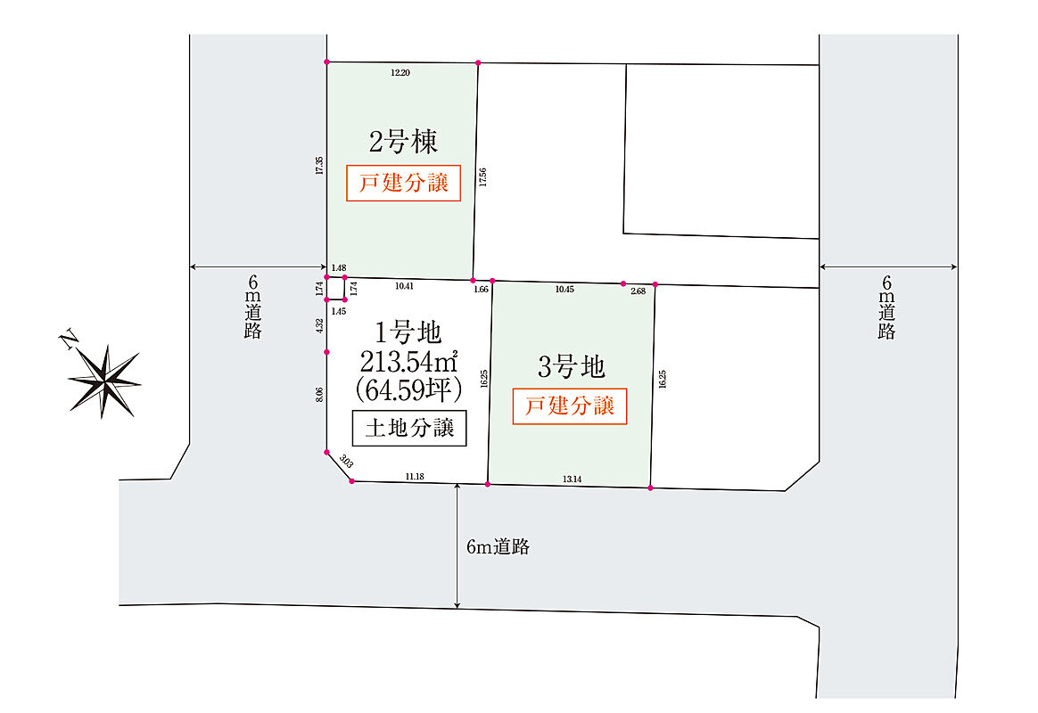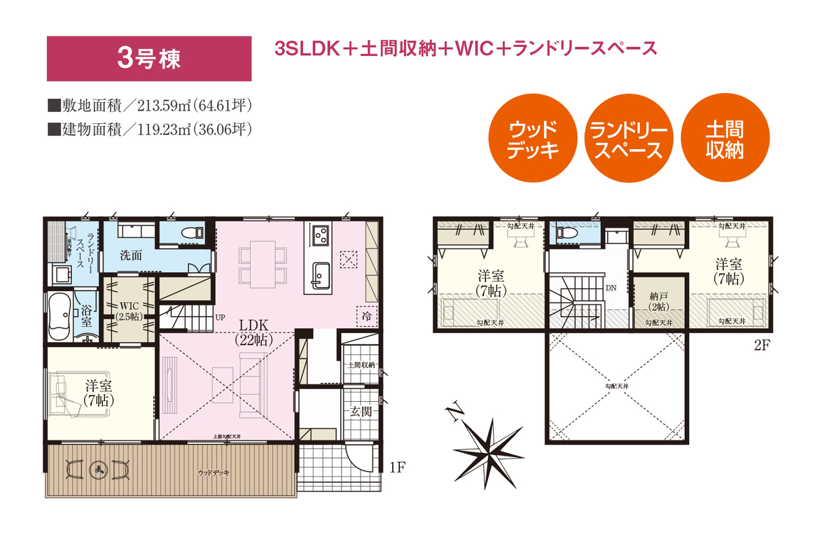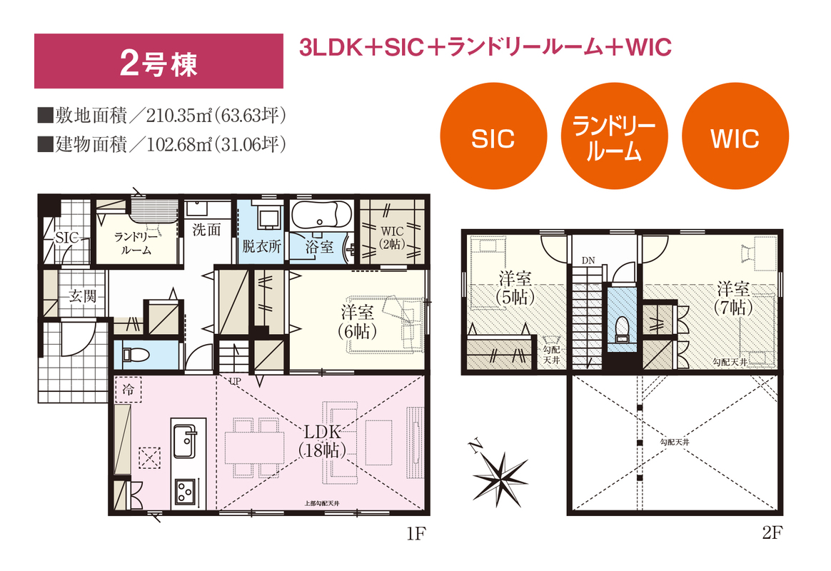 | 建物面積 | 102.68m2(2号棟)~119.23m2(3号棟) | 土地面積 | 210.35m2(2号棟)~213.59m2(3号棟) |