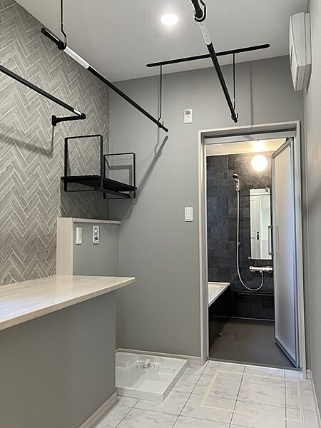 ランドリールームには収納付きカウンターがあり、使い勝手の良い家事スペースとなっています。室内物干し付きのため、部屋干しも可能です。