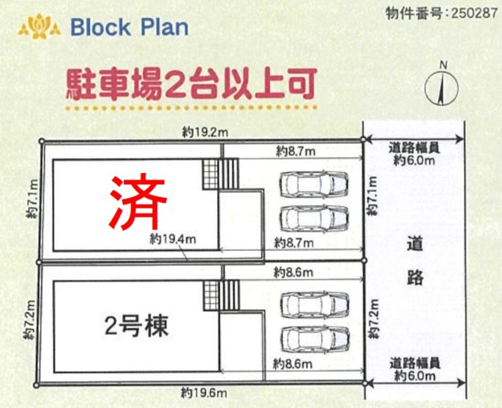 | 駐車場 | 2台 | 道路の幅員 | 道路幅:6.1m~6.3m、アスファルト舗装 |
