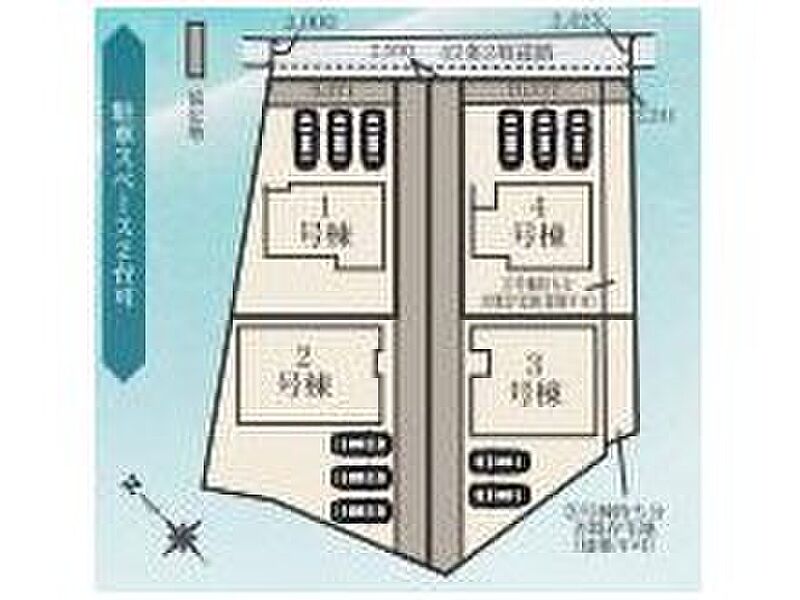 | 駐車場 | 2台 ~ 3台(1号棟、2号棟、4号棟(3台)・3号棟(2台)) | 道路の幅員 | 道路幅:2m~2.4m、アスファルト舗装 |