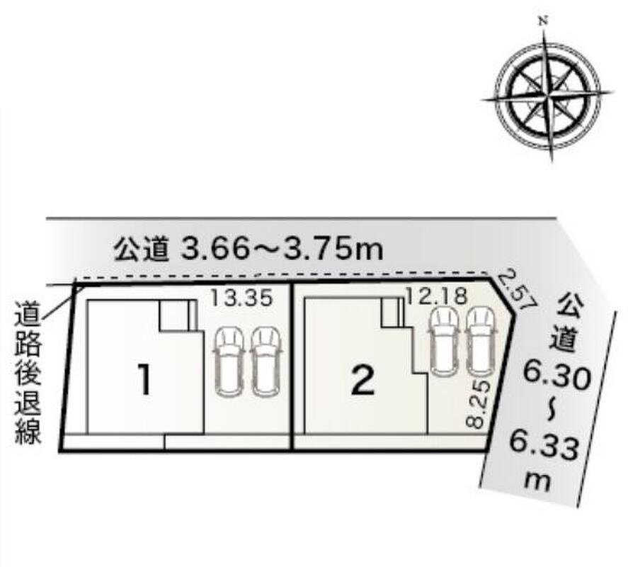 | 駐車場 | 2台 | 道路の幅員 | 道路幅:3.6m~6.3m、アスファルト舗装、私道負担:2.26m2(1号棟)2.02m2(2号棟) |