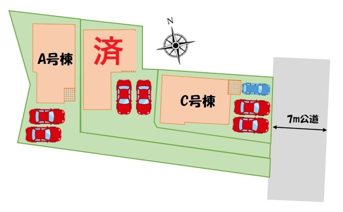 | 駐車場 | 2台 ~ 3台(※C号棟(車種により3台)) | 道路の幅員 | 道路幅:7m、アスファルト舗装 |