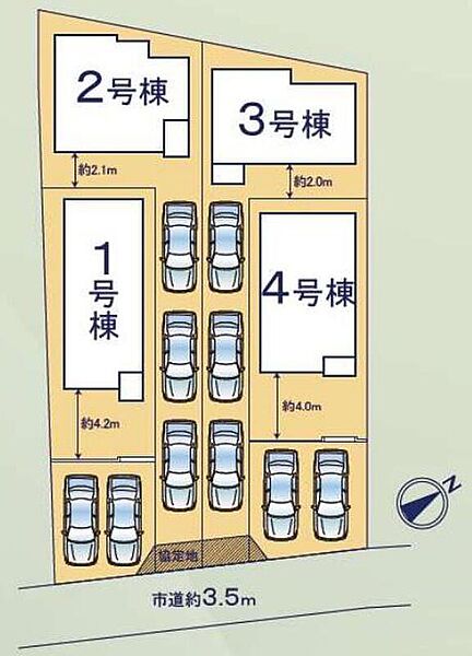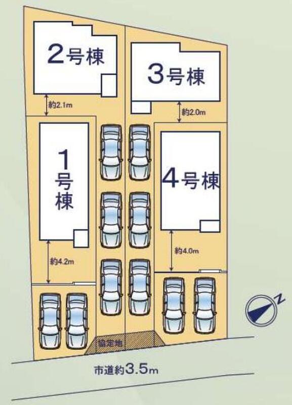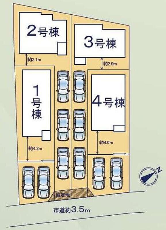 | 駐車場 | 2台 ~ 3台(1号棟・4号棟(2台)、2号棟・3号棟(3台)) | 道路の幅員 | 道路幅:3.5m、アスファルト舗装 |