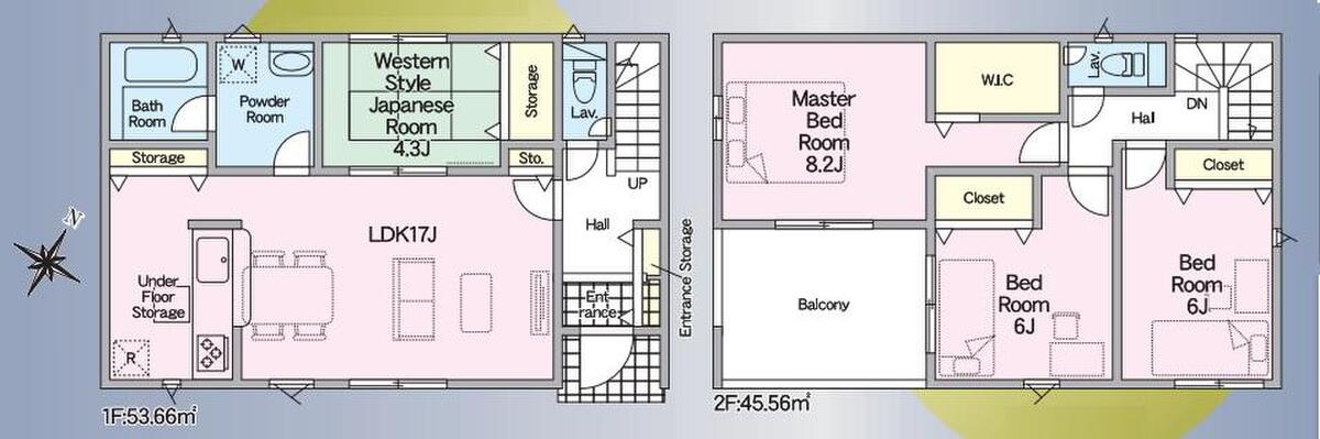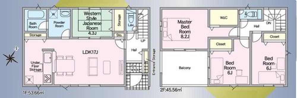 | 建物面積 | 95.57m2・99.22m2(28.90坪・30.01坪) | 土地面積 | 186.24m2・197.31m2(56.33坪・59.68坪) |