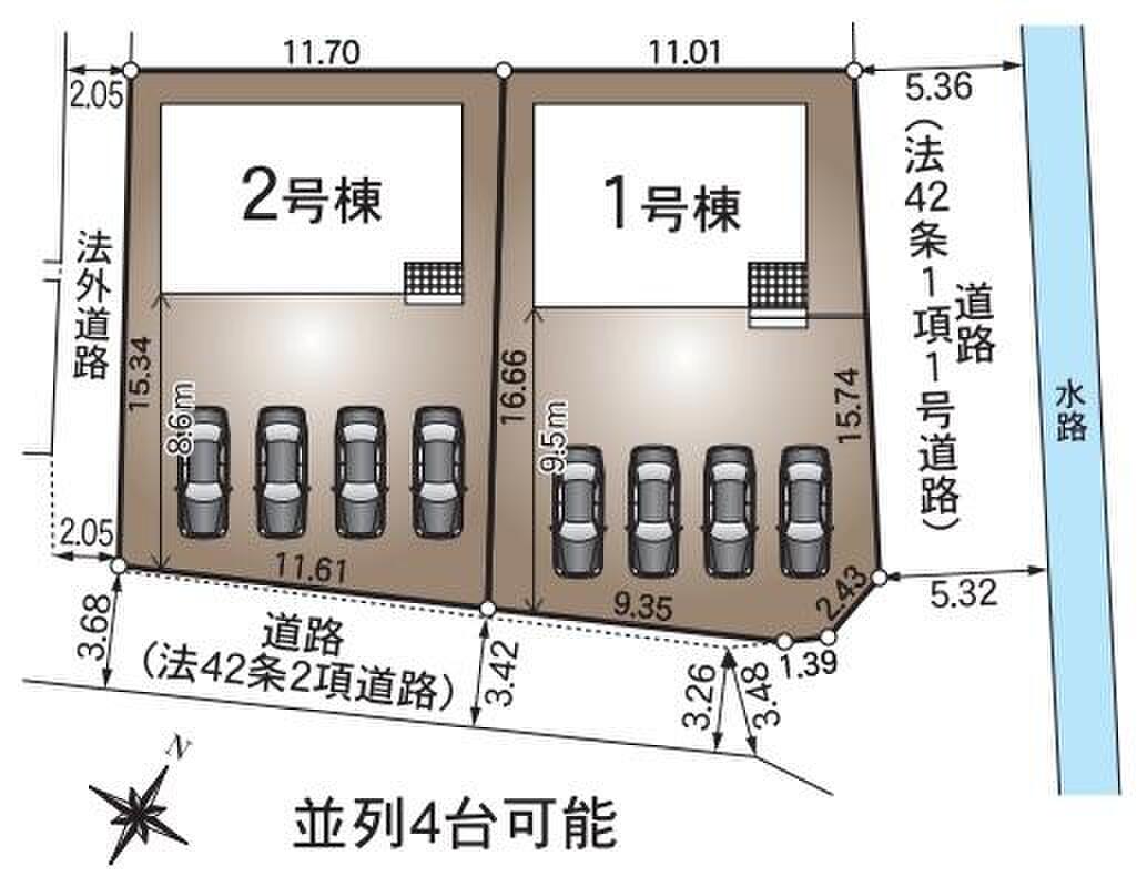 | 駐車場 | 4台 | 道路の幅員 | 道路幅:3.2m~5.3m、アスファルト舗装 |