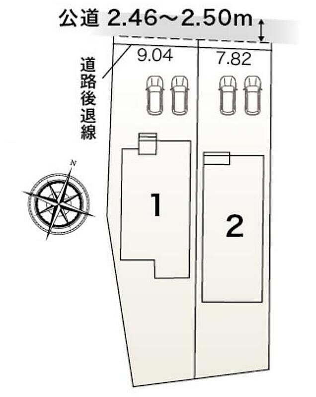 | 駐車場 | 2台 | 道路の幅員 | 道路幅:2.4m~2.5m、アスファルト舗装 |
