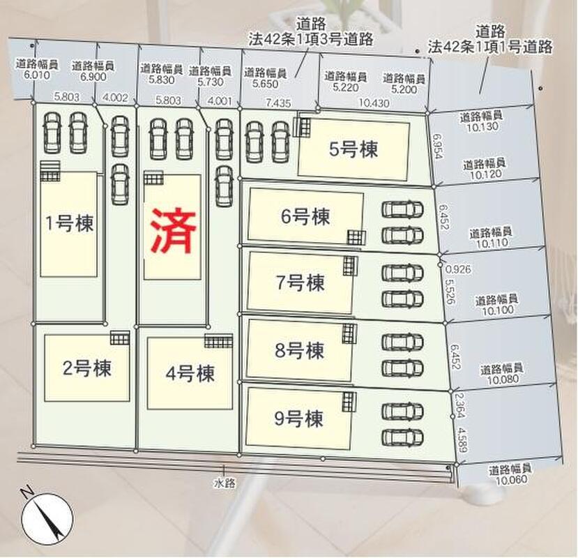 | 備考 | 【その他制限事項】住宅瑕疵担保責任供託 ルーフバルコニー面積:9.72m2(1,4,5,7,8号棟)、4.86m2(2号棟)、7.29m2(3,9号棟)、6.48m2(6号棟) | ||