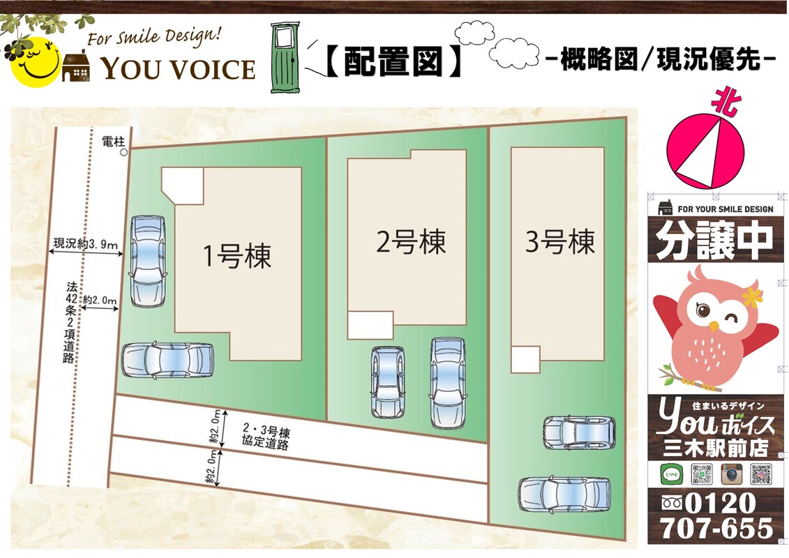 | 駐車場 | 2台 ~ 3台(■1号棟→2台■2号棟3号棟→2台~3台) | 道路の幅員 | 道路幅員約3.9m(公道) |