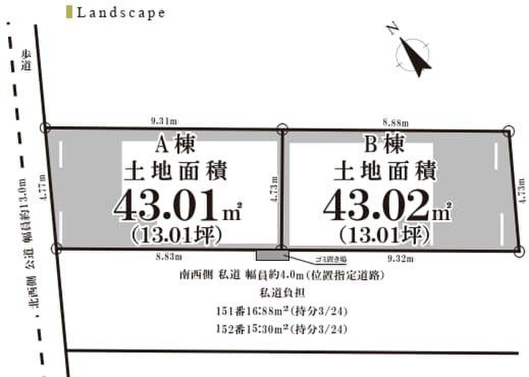 | 建物面積 | 83.78m2・95.35m2 | 土地面積 | 43.01m2・43.02m2 |