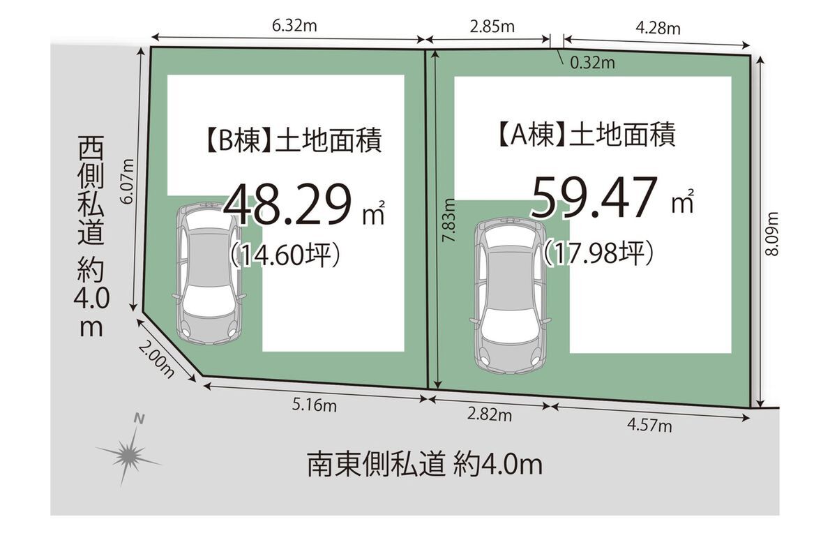 | 建物面積 | 88.88m2・104.28m2 | 土地面積 | 48.29m2・59.47m2 |