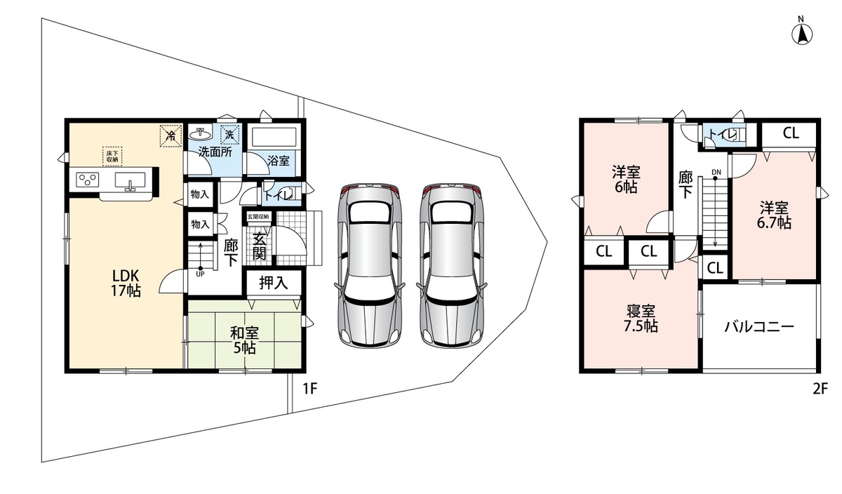 | 駐車場 | 2台 | 道路の幅員 | 南側6m・北側6.5m |