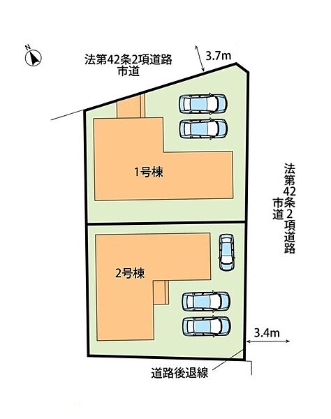 | 駐車場 | 2台 | 道路の幅員 | 北側3.7m、東側3.4m |