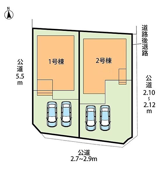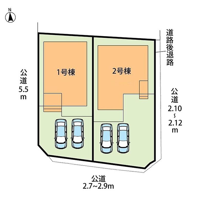 | 駐車場 | 2台 | 道路の幅員 | 西側5.5m、東側2.1m、南側2.9m |