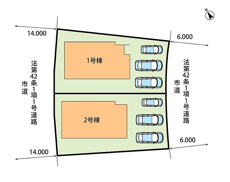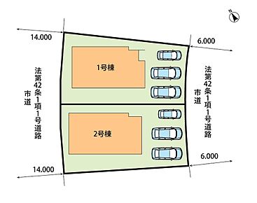 | 駐車場 | 3台 | 道路の幅員 | 南東側6.0m、北西側14.0m |