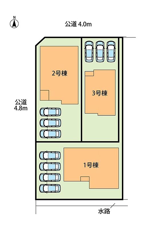 | 駐車場 | 3台 | 道路の幅員 | 北側4m、西側4.8m |
