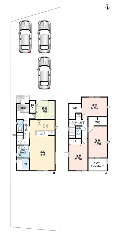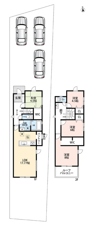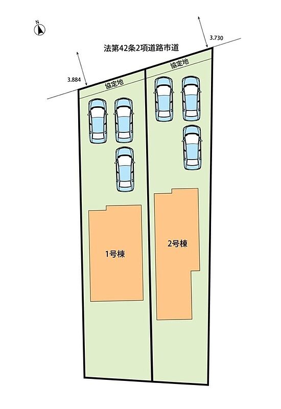 | 駐車場 | 3台 | 道路の幅員 | 北側3.8m、セットバック:(1号地)0.55m2、(2号地)0.86m2 |