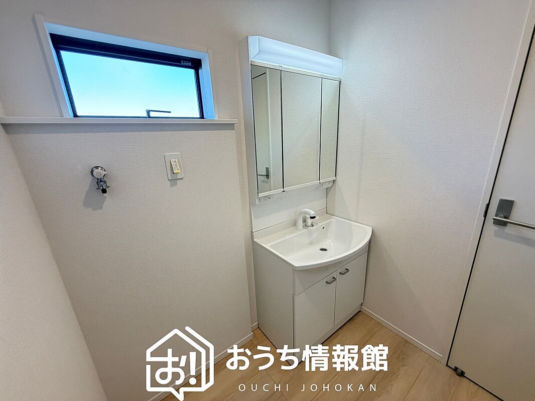 鏡の両サイドは、必要なものを取出しやすく、大きな鏡面で朝の準備も快適。 使いやすいリフトアップ機能付きのシングルレバーシャワー水栓付です。