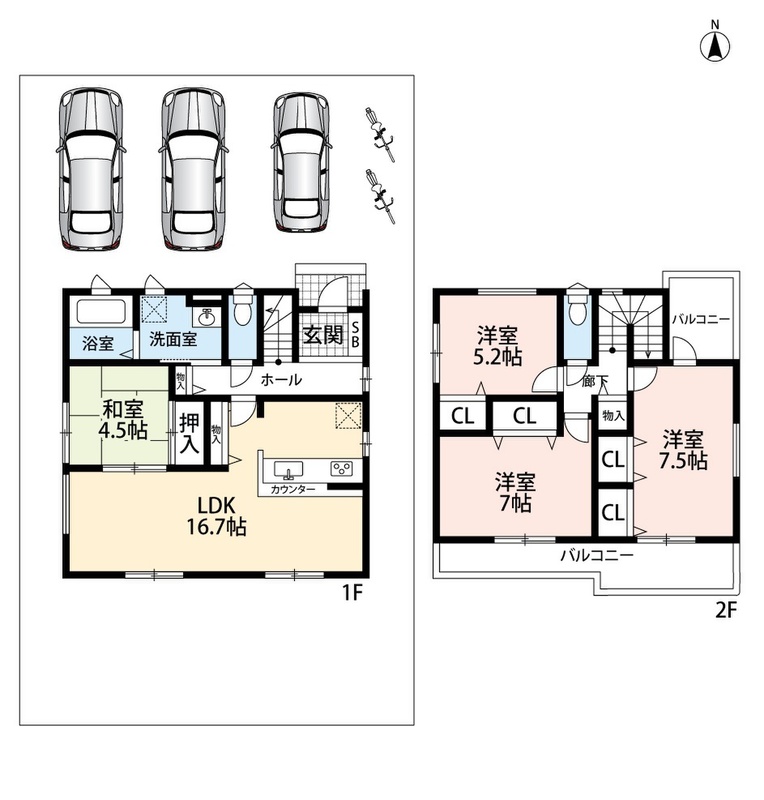 | 駐車場 | 3台 | 道路の幅員 | 北側5m |