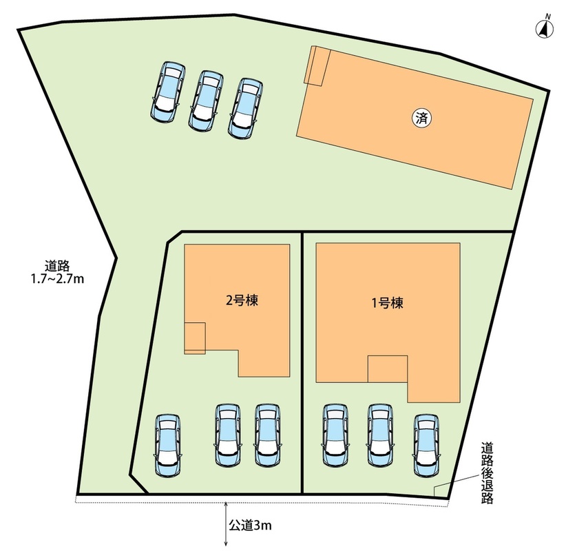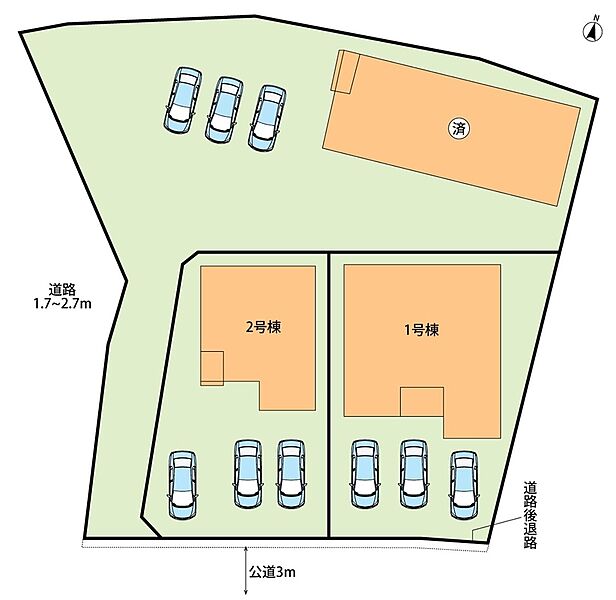 | 駐車場 | 3台 | 道路の幅員 | 西側2.7m、南側3m |