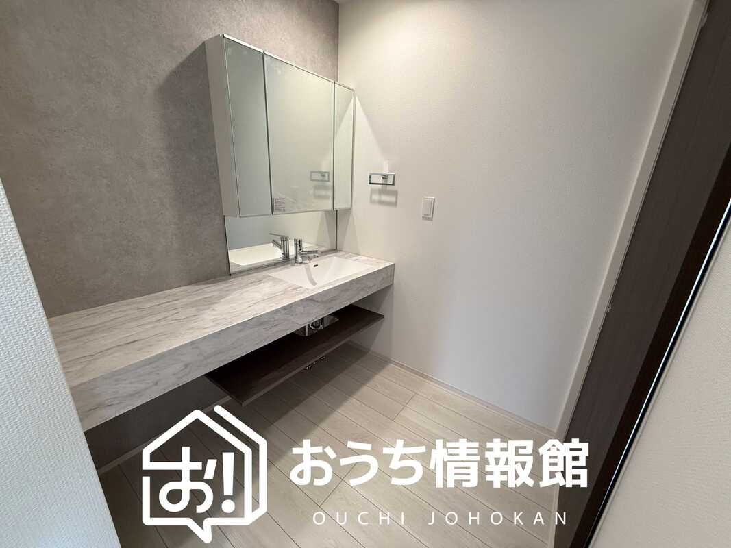 鏡の両サイドは、必要なものを取出しやすく、大きな鏡面で朝の準備も快適。 使いやすいリフトアップ機能付きのシングルレバーシャワー水栓付です。