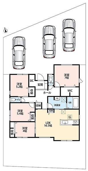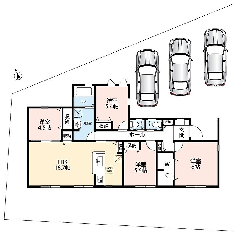 | 駐車場 | 3台 | 道路の幅員 | 北側4.7m~5.7m |