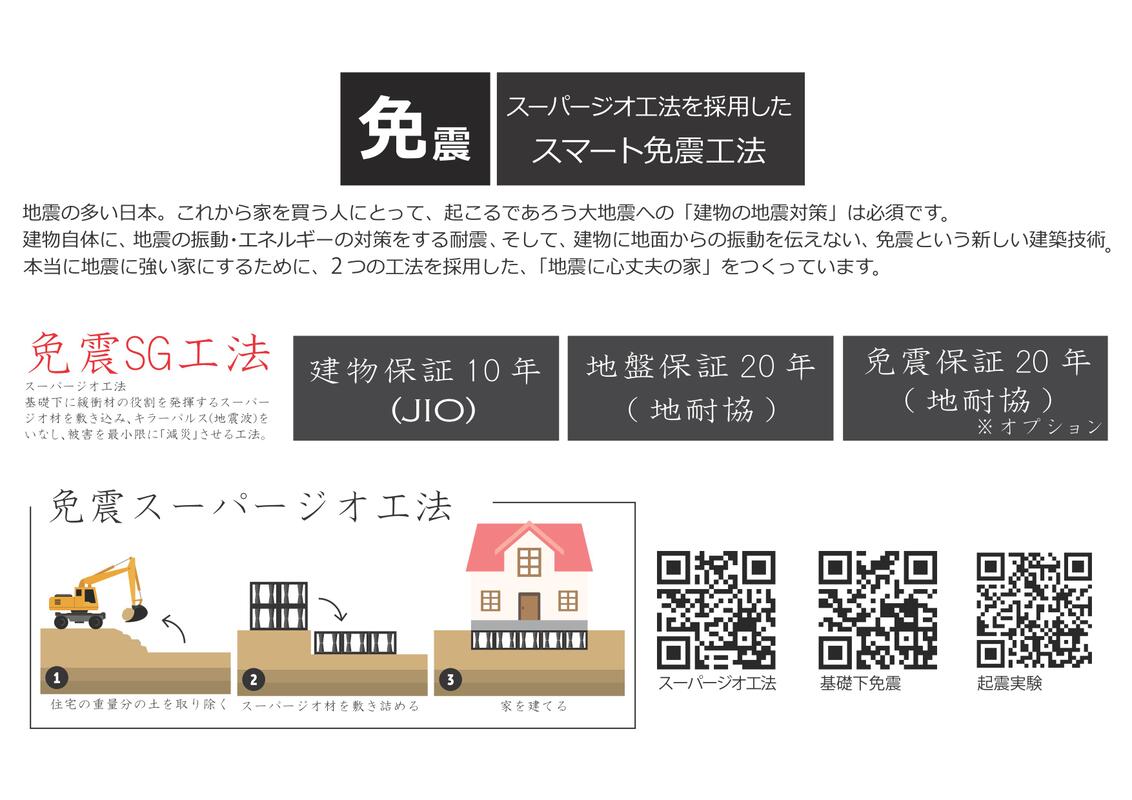 ◆ 免震SG工法とは、建物自体に地震の振動・エネルギー対策をする耐震、そして、建物に地面からの振動を伝えさせない、被害を減災させる工法です。安心の建物・地盤・免振保証付き。