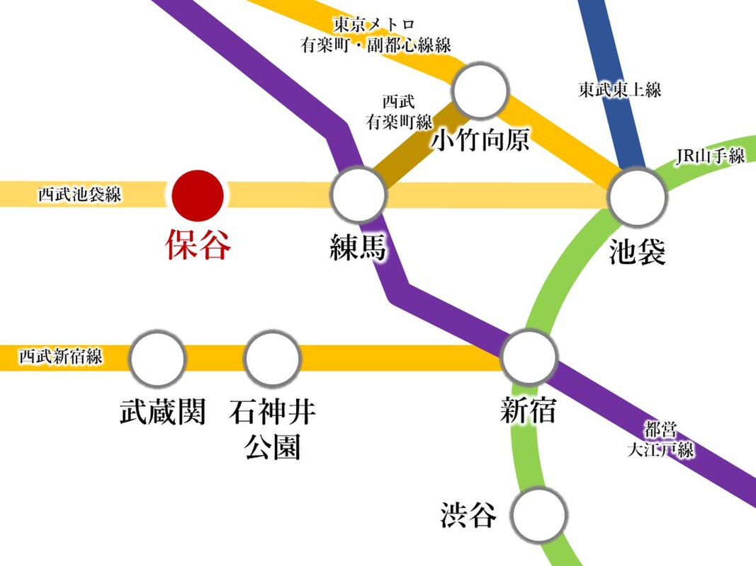 西武池袋線「保谷」駅 徒歩12分 西武池袋線「ひばりヶ丘」駅 徒歩19分 西武新宿線「東伏見」駅 西武バス7分「保谷駅南口」バス停 徒歩13分 |