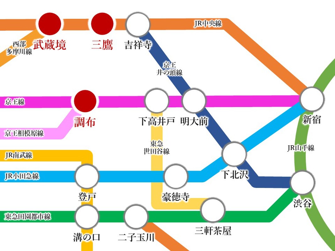 - JR中央線「三鷹」駅 バス乗車14分「山野」 徒歩3分京王線「調布」駅 バス乗車14分「山野」 徒歩3分JR中央線「武蔵境」駅 バス乗車20分「吉野南」 徒歩9分