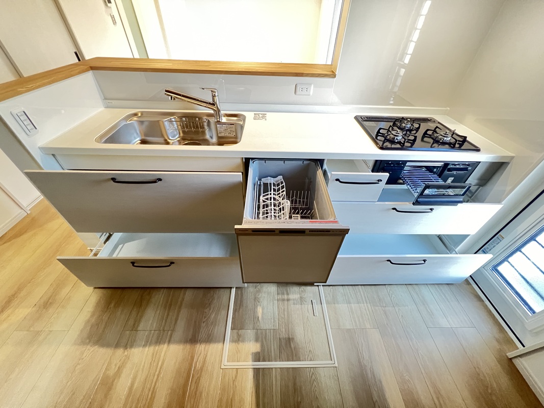 食器洗い乾燥機付きのシステムキッチンや三面鏡付き洗面台など嬉しい設備あり